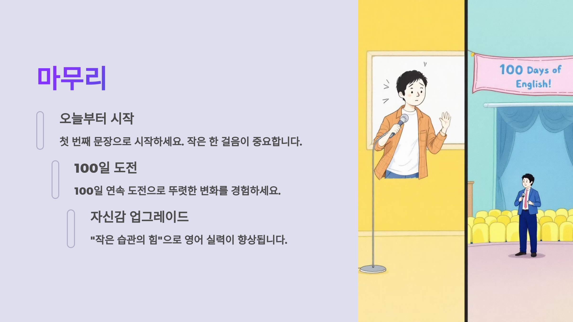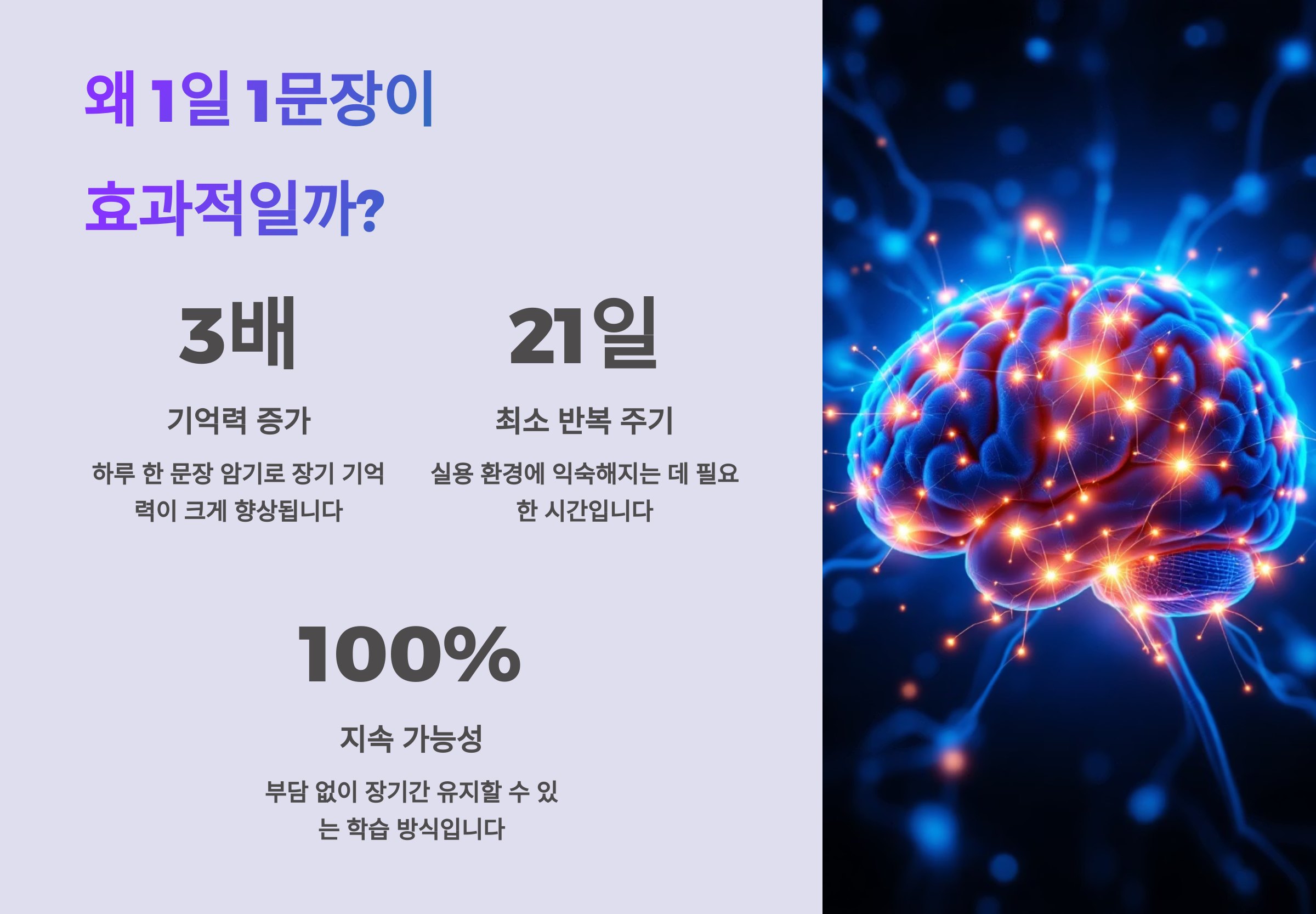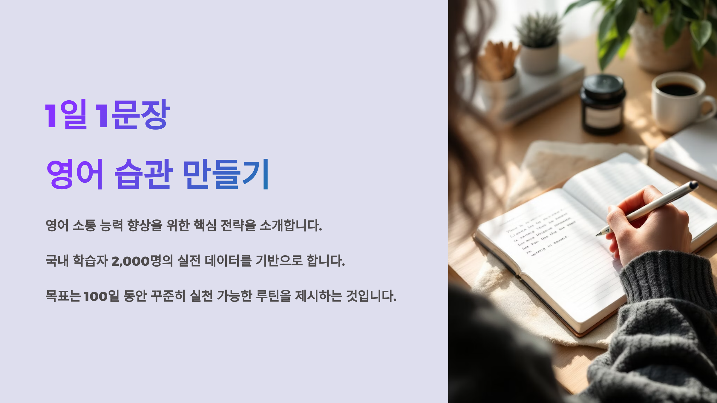 영어 실력은 단기간에 확 늘지 않아요. 하지만 매일 한 문장, 꾸준한 5분이 실제로 말할 수 있는 영어를 만들어줘요. 그게 바로 ‘1일 1문장’ 루틴이 가진 힘이에요! 💪📘