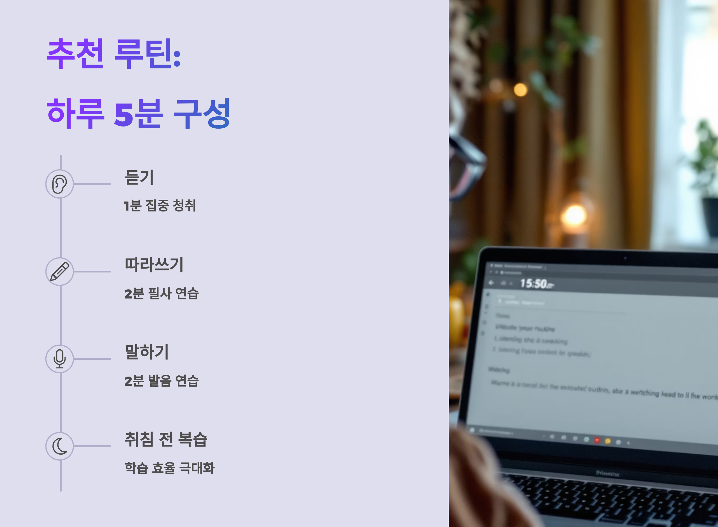 하루 5분, 영어 문장 하나에 집중하는 루틴이 회화 실력, 문장 이해력, 말하기 반응 속도를 모두 올려줘요. 짧지만 가장 실속 있는 루틴을 소개할게요! 📘🗣️