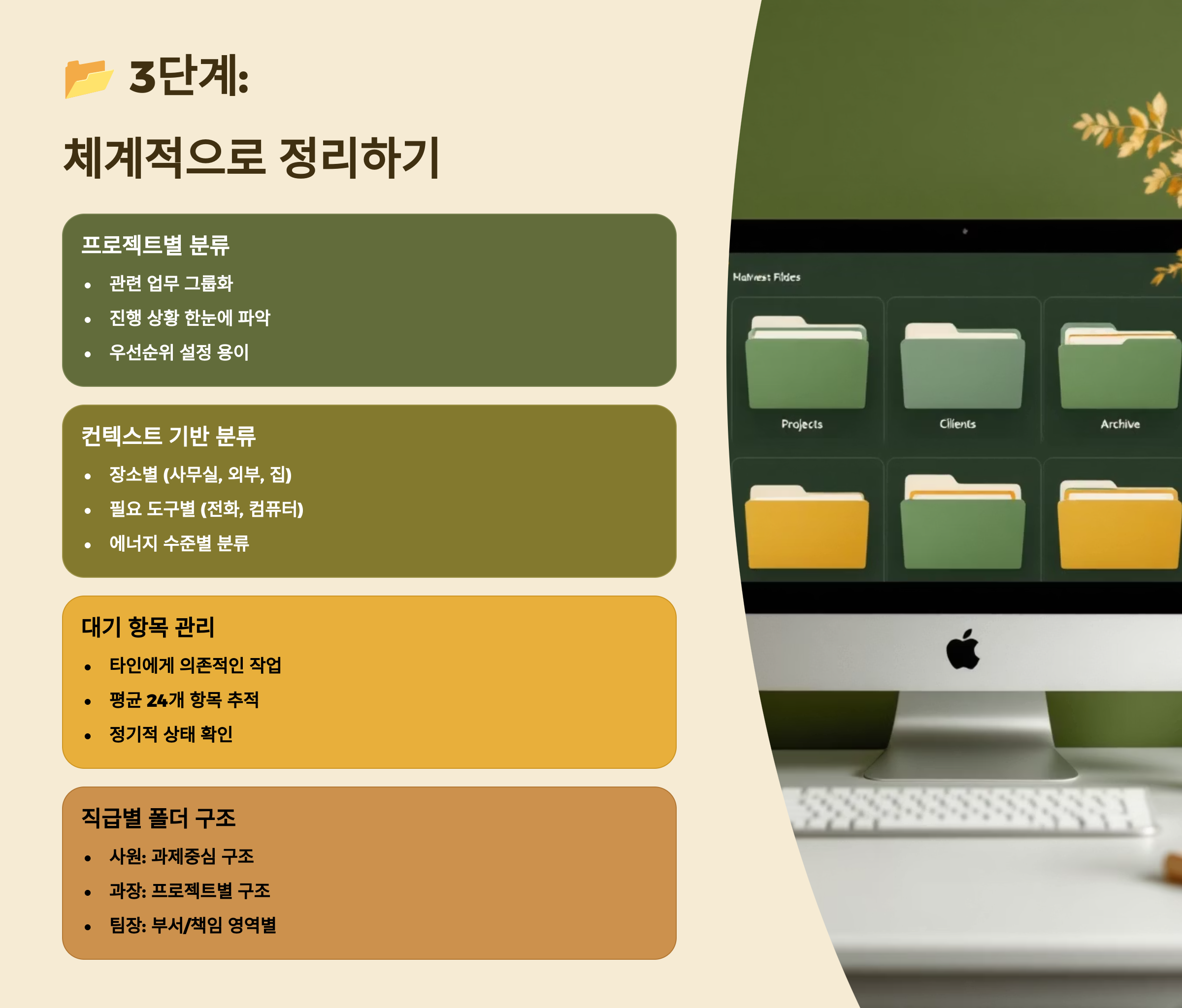 📁 자, 이제 실행 가능한 정보들을 어떻게 보관하고 관리할 것인지 정할 시간이 왔어요. GTD의 정리(Organize) 단계에서는 각 항목들을 체계적으로 분류해서 언제든 꺼내볼 수 있는 형태로 만들어야 해요.