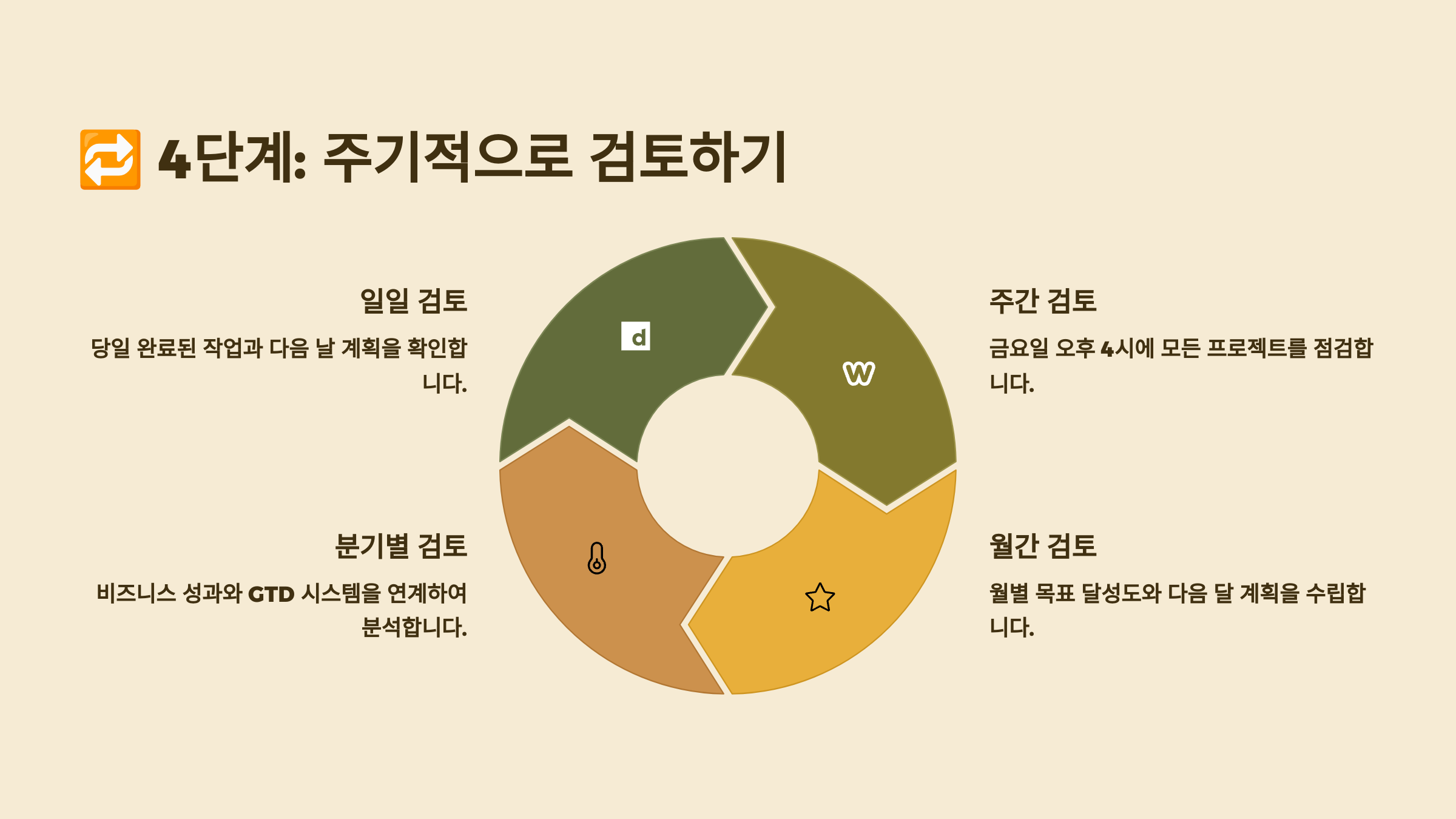 📅 GTD를 제대로 운영하려면 시스템을 지속적으로 관리하고 점검하는 루틴이 필요해요. 그게 바로 네 번째 단계, 검토(Review)예요. 정리만 잘 해놓고 보지 않으면 소용 없겠죠? 🤔