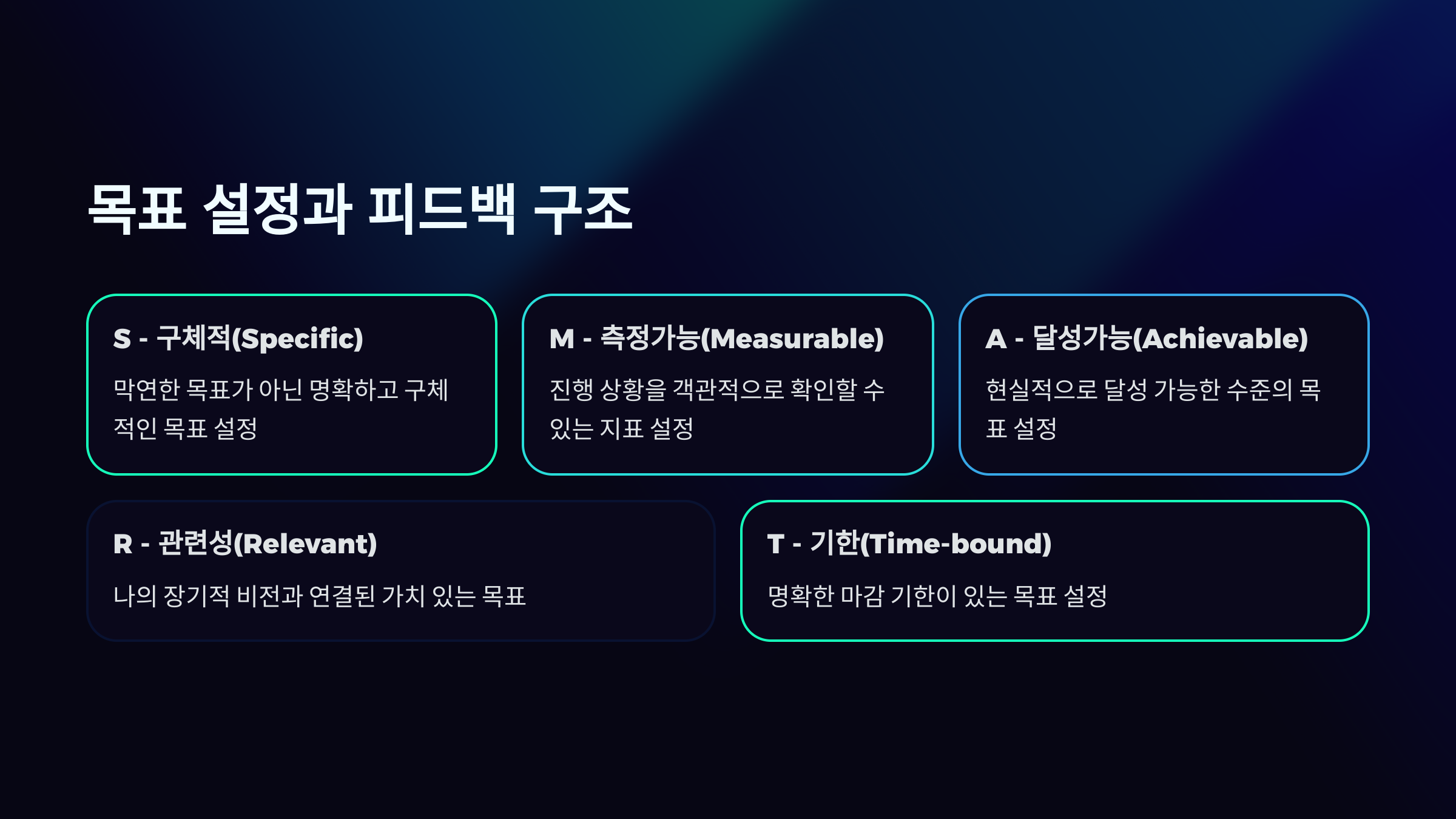 📌 “운동해야지”, “공부해야지” 이런 말, 누구나 해요. 하지만 문제는 그게 막연하다는 거예요. 막연한 목표는 결국 실행되지 않아요. 그래서 필요한 게 SMART 목표 설정법과 피드백 루프예요.