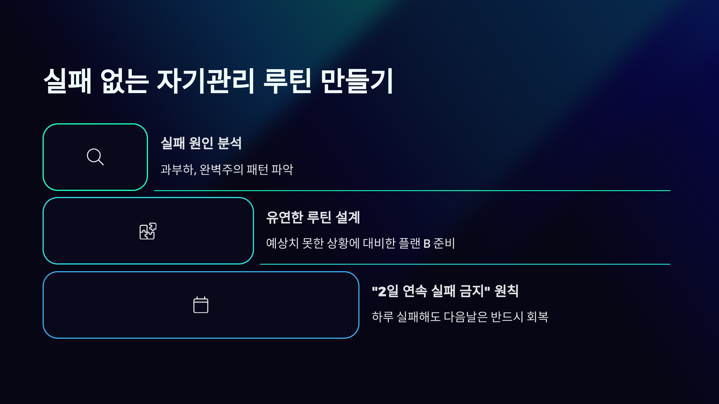 🌟 의지는 순간의 힘, 동기는 방향, 루틴은 시스템이에요. 이제 마지막 퍼즐은, 실패 없이 이 모든 걸 운영하는 자기관리 루틴 만들기! 바로 이어집니다! 🧩