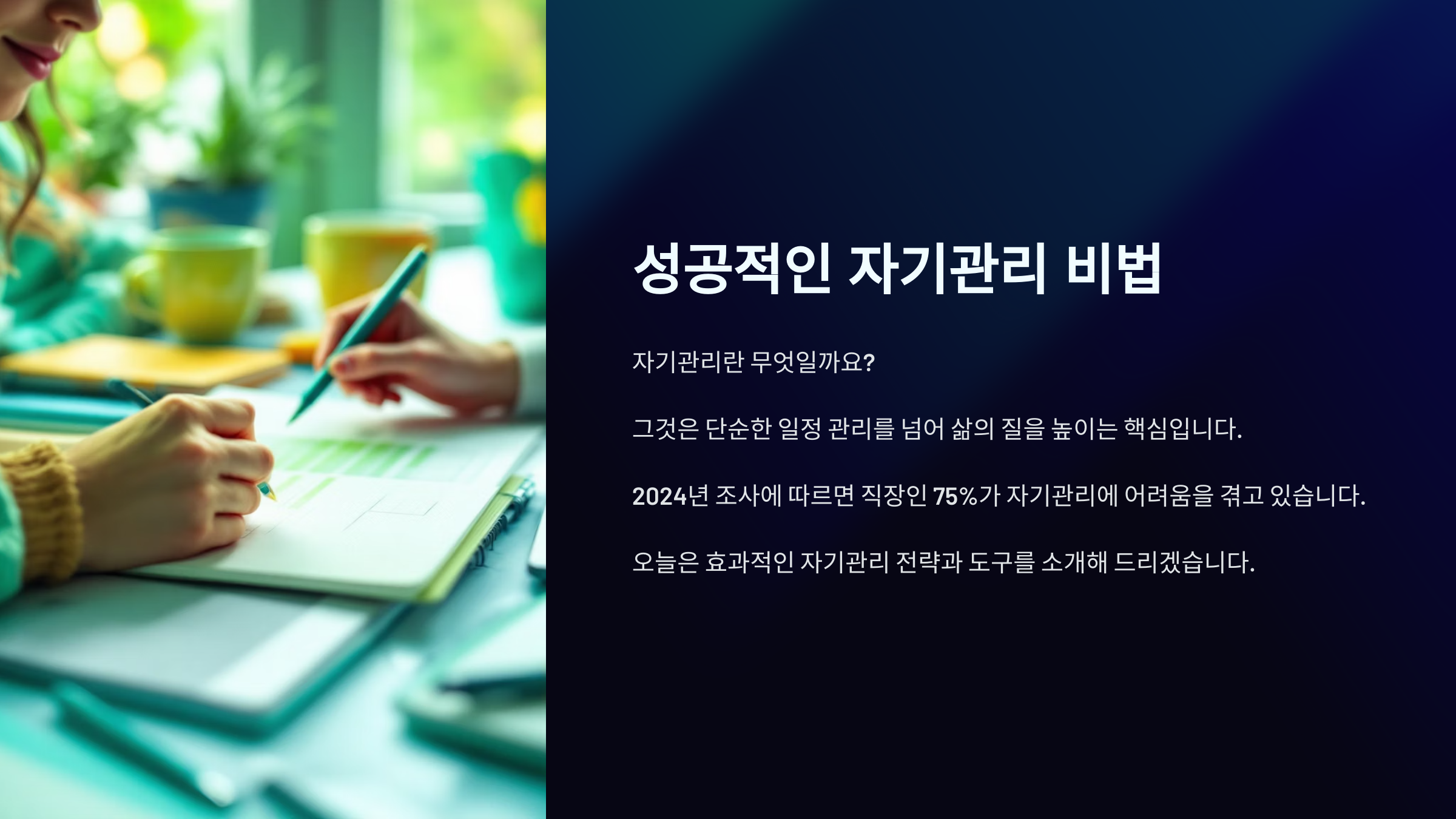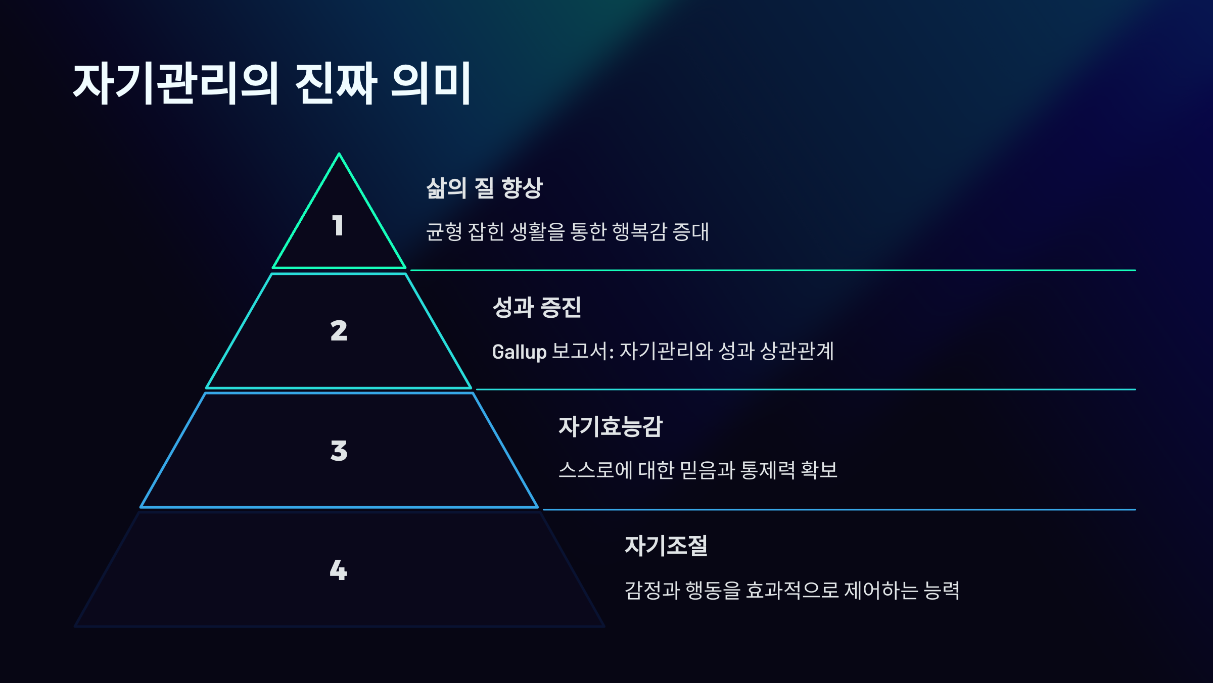 📖 자기관리가 중요한 이유는 간단해요. 우리는 너무 많은 정보, 선택, 기회 속에 살고 있고, 그걸 ‘내 식대로’ 정리하지 않으면 언제든 휩쓸릴 수밖에 없기 때문이에요. 자기관리는 그래서 ‘나를 지키는 도구’이자 ‘성공의 발판’이에요.