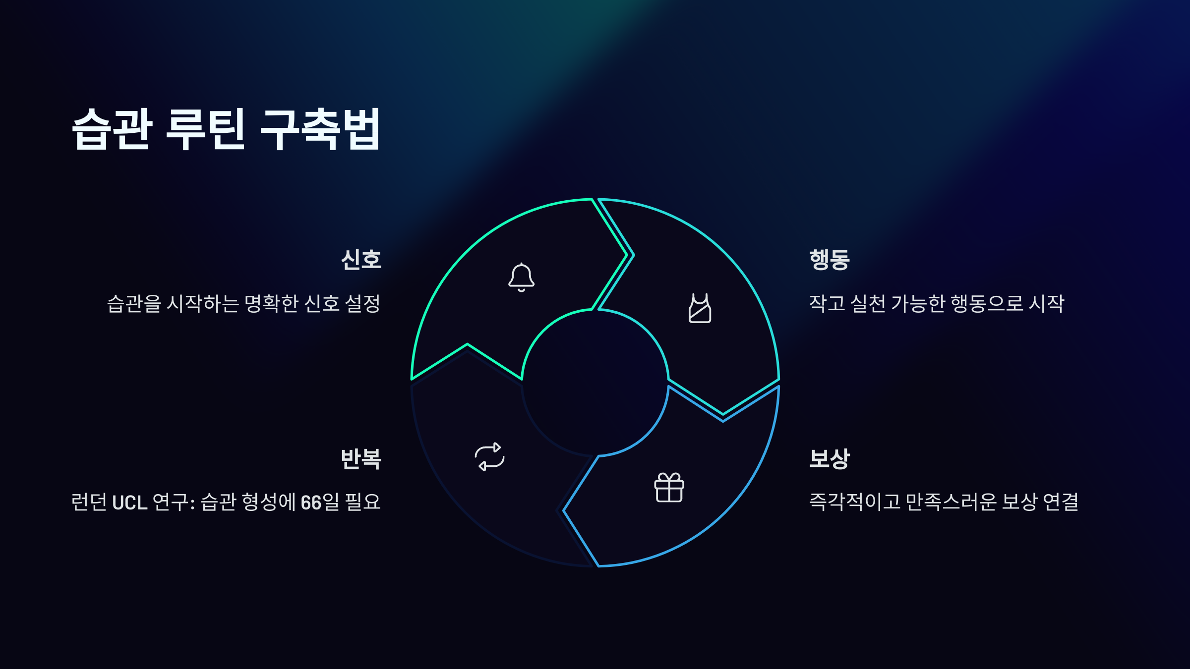 📖 루틴이 되려면 단순히 반복하는 걸 넘어서 의식처럼 자연스럽게 생활에 스며들어야 해요. 그 비결은 바로 ‘트리거 → 행동 → 보상’의 3단계 습관 구조예요. 이걸 잘 활용하면, 어떤 행동도 루틴으로 만들 수 있어요!