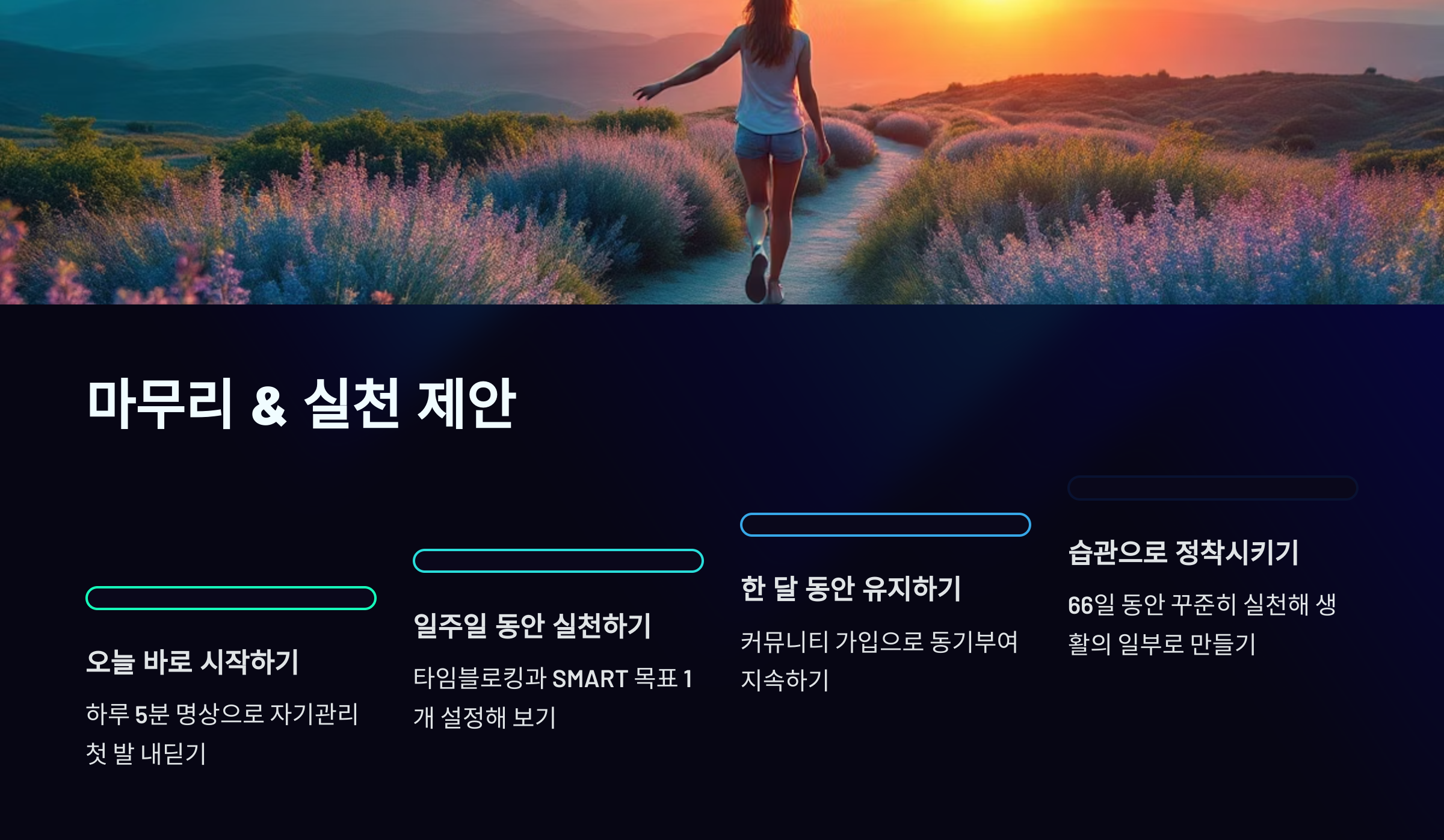 📌 자기관리는 어떤 특별한 사람만 하는 게 아니에요. 내 삶을 내가 책임지고 설계해보고 싶은 사람이라면 누구나 지금 이 순간부터 시작할 수 있어요.