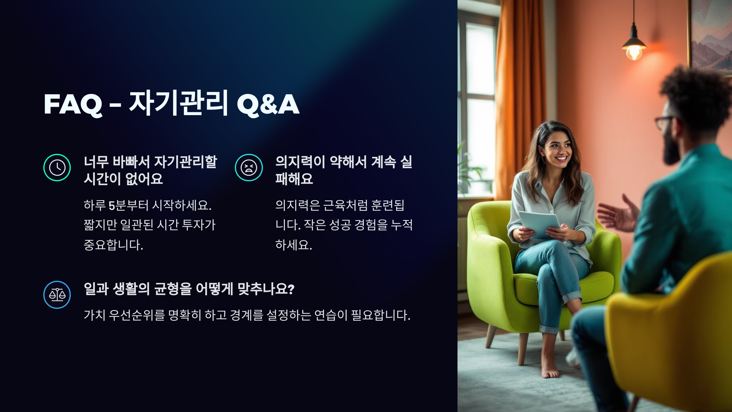 ✨ 자, 이제 진짜 실천만 남았어요. 다음은 많이 묻는 자기관리 관련 ❓ FAQ 8가지 정리해서 알려드릴게요! 😊